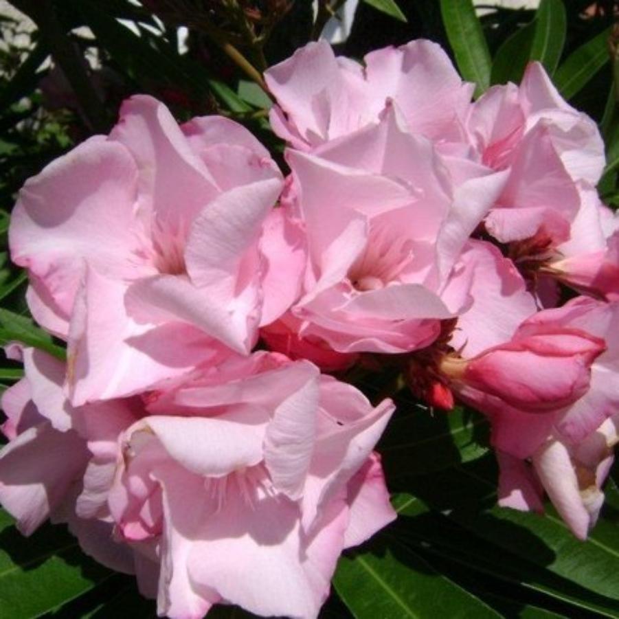 Олеандр обыкновенный Луи Пуже (лат. Nerium oleander Louis Pouget) - гигантский сорт. Кустарник вечнозеленый, быстрорастущий. Листва темно-зеленого окраса, узкая и длинная. Цветки очень крупные, достигают 7-8 см в диаметре. Они махровые, нежно-розовые с широкими и очень тонкими, слегка закругленными лепестками, обладают приятным запахом. Внимание! Олеандр - ядовитое растение, поэтому при его культивировании требуется осторожность.